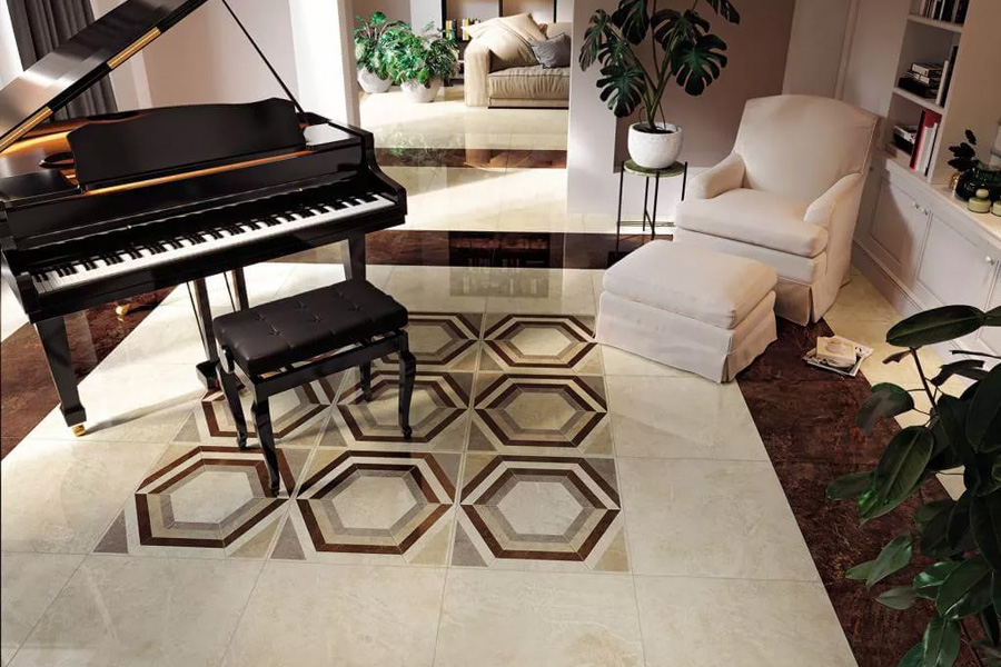 Можно сочетать стандартную фоновую плитку с декоративной. Цветовая гамма выдержана в бежевых тонах. Помещение, в котором преобладают натуральные природные оттенки, будет легким и приятным для пребывания, обеспечит полноценный отдых и расслабление. Для декорирования пола можно выбрать плитку матовую или с частичной полировкой. Размеры 60x60 см и 60x120 см. Матовый керамогранит является универсальным решением. Он полностью безопасен. Поверхность слегка шероховатая, что исключает вероятность падения или соскальзывания. Вариант с частичной полировкой создает привлекательный внешний вид и утонченный дизайн. Размер плитки: 60х60 см, толщина 2 см. Изделие долговечное и надежное, имеет высокую прочность и устойчивость к механическому воздействию, истиранию, температурным перепадам и воздействию воды или конденсата. Благодаря этому уход за покрытием будет максимально простым.