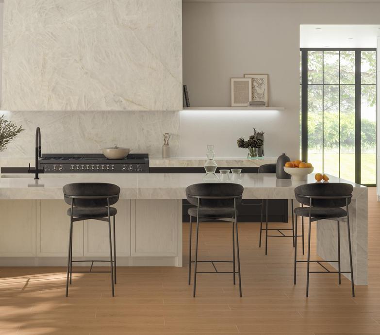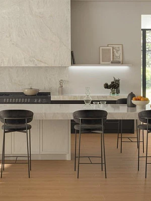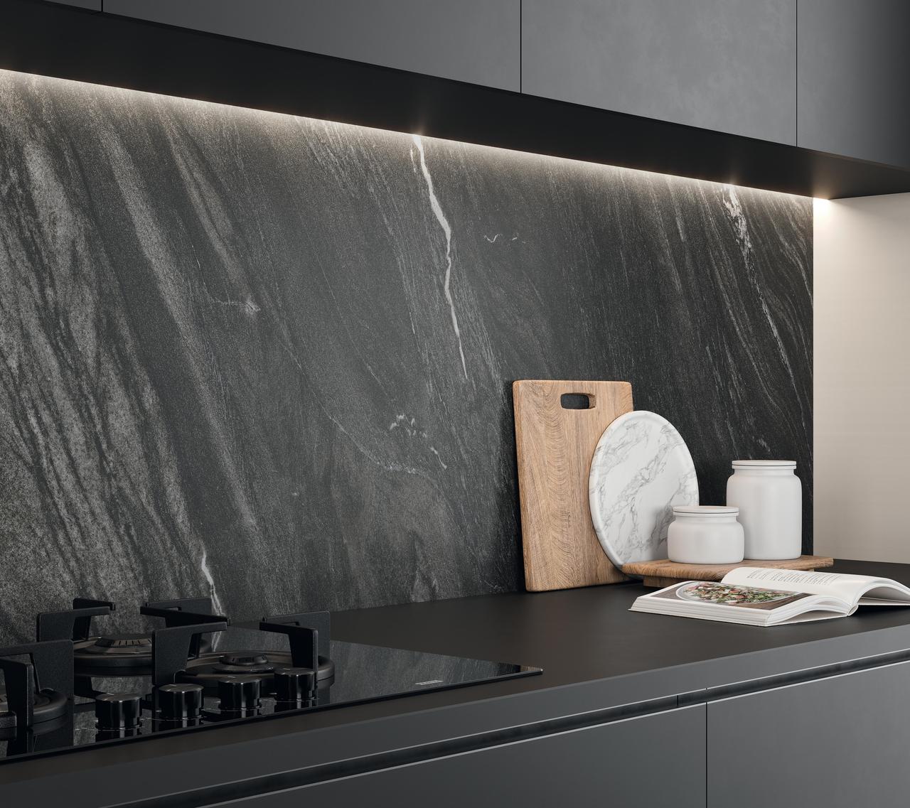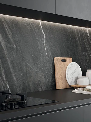 Керамика с имитацией природного камня открывает новые возможности для контрастных интерьеров. Коллекции под мрамор, такие как Marvel от Atlas Concorde, предлагают черную плитку для кухни с характерными прожилками и глубиной натурального материала. Темный мрамор на фартуке или столешнице в окружении белых фасадов создает роскошный образ, который не требует дополнительного декора. Прожилки на поверхности добавляют движение и делают композицию менее статичной, чем при использовании однотонной керамики.